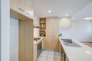 * Modern kitchen with Stainless steel appliances, gas cooktop, dishwasher, stone benchtop